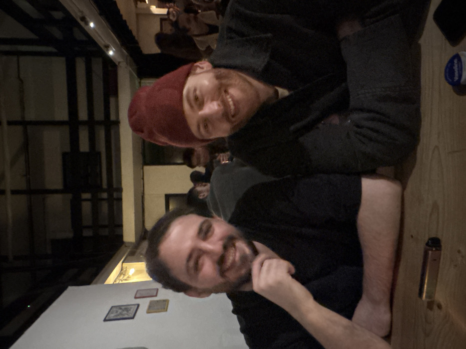 Two men are smiling in a rotated, candid shot. The man on the bottom wears a black shirt and has a dark beard, resting his chin on his hand. The man above him wears a red beanie and a dark coat. The background shows a gathering of people, with what appears to be an outdoor dining or patio area. The table has a vape and a small container on it. The scene has warm lighting.