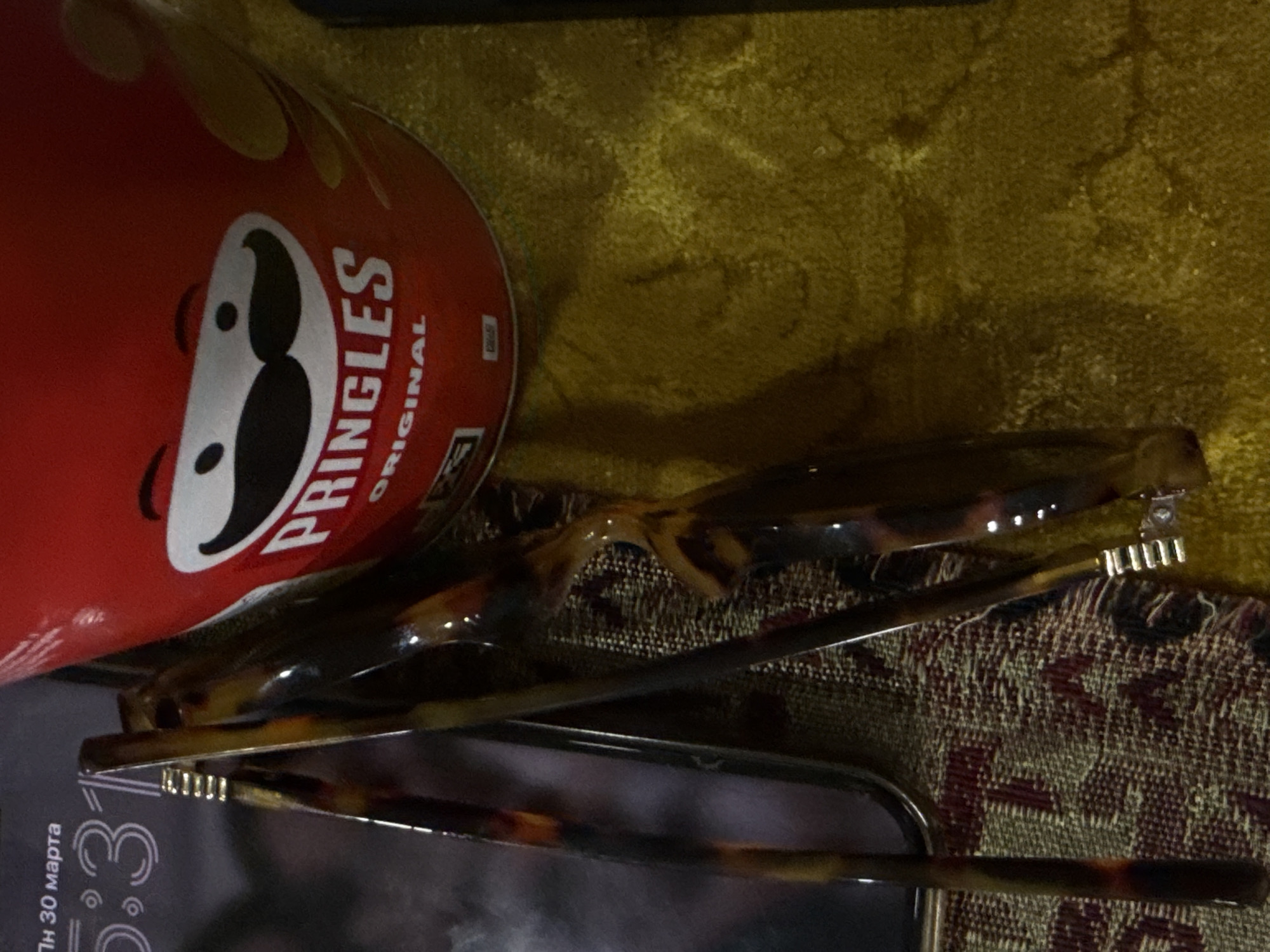 can of Pringles Original potato chips lying next to a pair of tortoiseshell-patterned glasses on what appears to be a patterned blanket or cloth surface