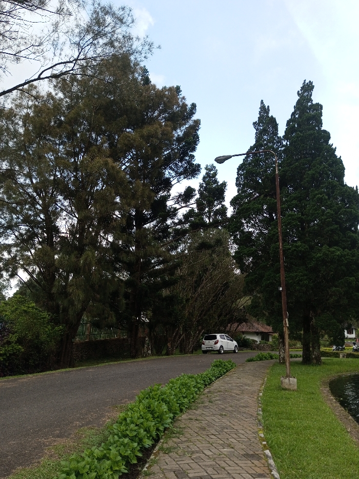 The image depicts a static outdoor scene, likely a park or roadside area, within the city of Ambositra, Madagascar. In the foreground, an asphalt road curves to the right, separated by a neatly maintained row of vibrant green plants from a parallel paved brick pathway. To the right of the pathway, a strip of green grass borders a dark body of water. A tall, weathered utility pole with a dark gray street lamp fixture stands upright on the right side, positioned between the paved path and the grassy edge. In the midground, a white compact hatchback car is parked on the right side of the asphalt road, facing away from the viewer. Behind the car and further into the background, a small building with a reddish-brown tiled roof is partially visible among dense foliage. The scene is dominated by numerous large trees with varying types of foliage, ranging from dark green coniferous trees on the right and center-right to lighter green and more open-canopied trees on the left. The background is composed of a continuous dense canopy of trees. The sky above is light blue with sparse white clouds. No individuals are present in the frame.