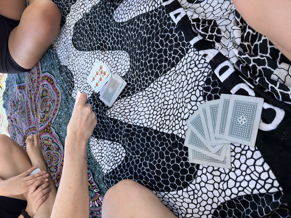 - "Three individuals are observed playing cards outdoors on patterned blankets in Pinamar, Argentina" by FM-kv6z32, licensed under CC BY 4.0