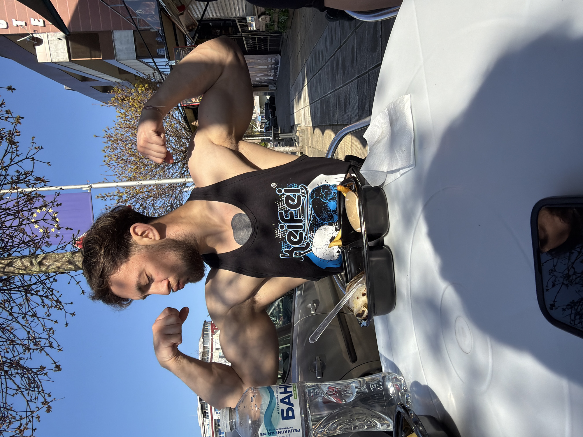 muscular man flexing his arms at an outdoor table. He is wearing a black tank top with a distinctive graphic design. A bottle of "BANI" water and a black food container with food are on the table. The table is white and appears to be in an outdoor seating area. A tree and a building are visible in the background. The sky is blue. Based on the location "БАНІ" on the water bottle and the architecture, it is likely that the photo was taken in Primorsko, Bulgaria.