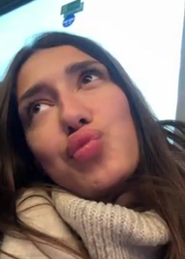 A woman with long brown hair and wearing a white sweater is looking at the camera. She makes a kissing face, then looks to the side, and then smiles. The background appears to be the interior of a bus or train, with a light-colored wall and a sign visible.