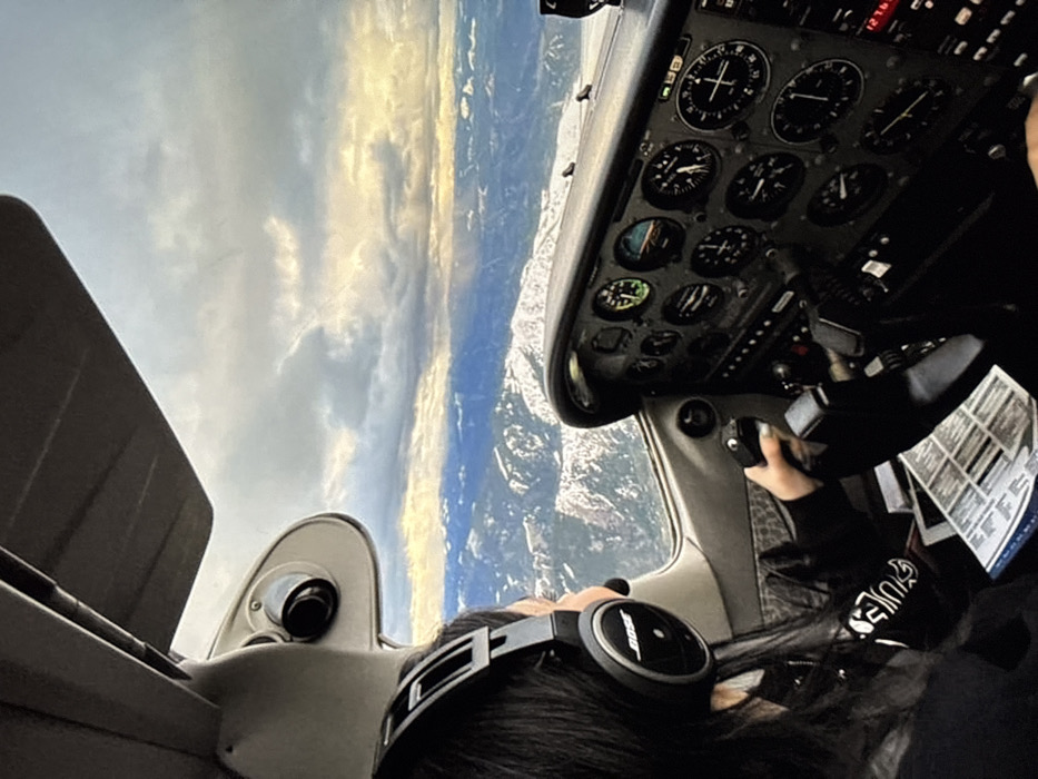 This image depicts an aerial perspective from within the cockpit of a light aircraft, with its context attributed to Meistratzheim, France. The scene focuses on a pilot, observed from the chest up, occupying the left seat. The pilot wears black Bose over-ear headphones with an attached microphone boom. Their left hand, featuring light-colored fingernail polish, is positioned to grip the black aircraft yoke. Directly beneath the yoke, a white, gridded document, resembling a checklist or flight plan, rests on a surface. The instrument panel in front of the pilot is visible, containing numerous analog gauges, dials, and a partially discernible digital display showing "127.15" and "16". Through the aircraft's windshield, a vast mountainous landscape unfolds, characterized by extensive snow cover on peaks and valleys. The sky is partially overcast with grey clouds, interspersed with areas where sunlight penetrates, casting distinct light shafts onto the distant snow-covered terrain.