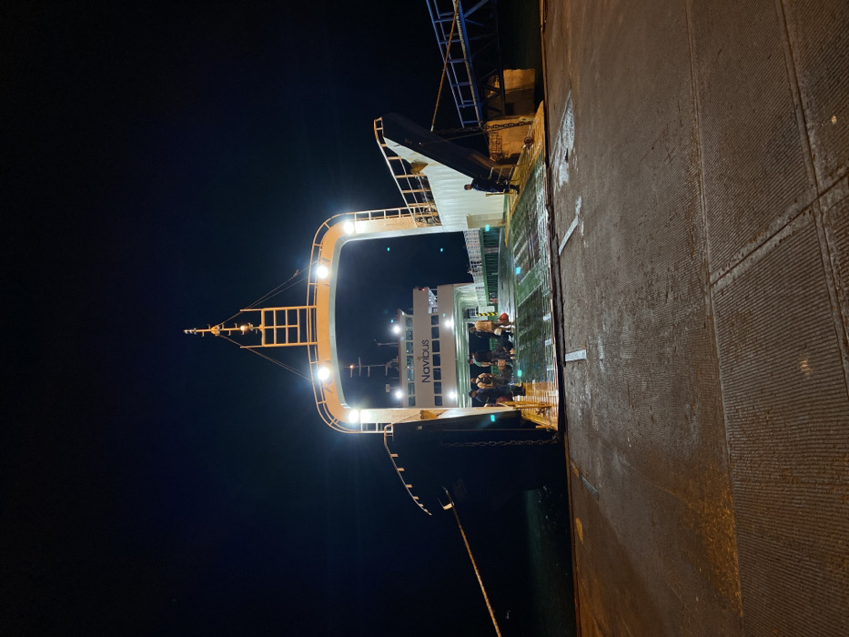 A ferry named "Navibus" is docked at night, illuminated by its bright lights. Passengers disembark onto a textured, concrete quay or pier. The ship's bow is visible against the dark sky. Rigging and antennae extend from the ship's upper structure. A gangway connects the ferry to the dock, facilitating passenger movement. The pier surface is wet, reflecting some light.