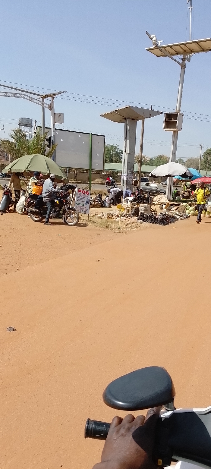 This image captures a daytime scene in the city of Kakuri Gwari, Nigeria, at what appears to be a busy roadside market intersection