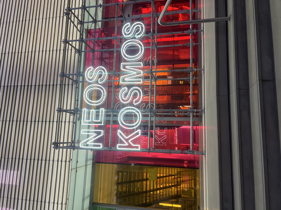 The image depicts a modern building entrance in the Neos Kosmos district of Athens, Greece