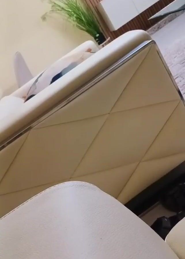 cream-colored leather sofa with a diamond-patterned design. The sofa has a silver trim along the top edge. There's a matching cream-colored chair in the foreground, slightly out of focus. In the background, there's a green plant in a pot and a white cabinet against a wooden wall. The room appears to be well-lit and modern. An audio clip plays during the video, uttering phrases related to embracing pain.