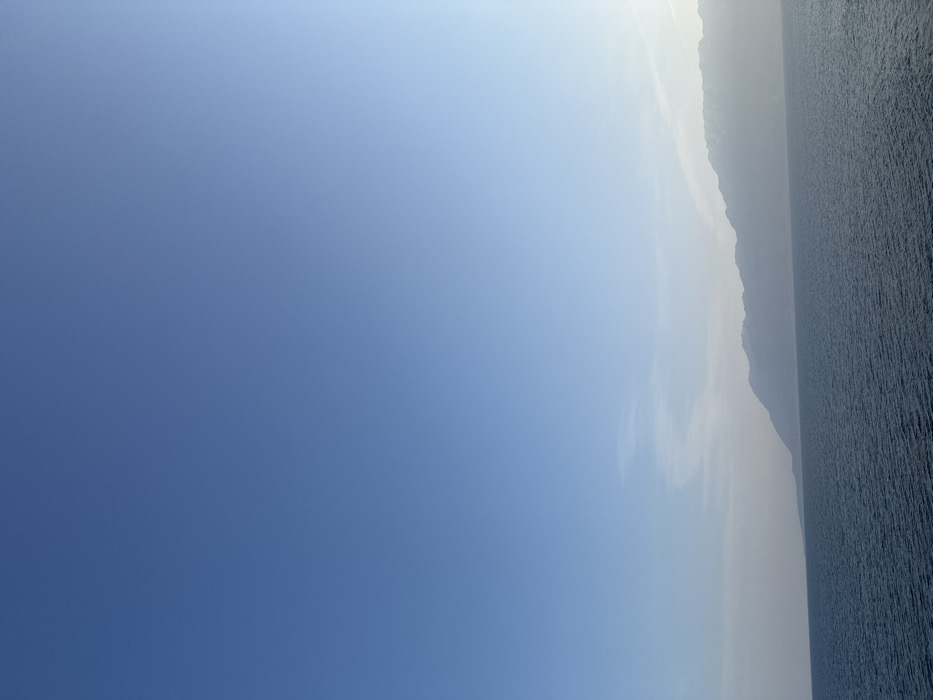 The image presents a panoramic view of a coastal environment in Kato Karioutes, Greece. The scene is divided into a clear blue sky occupying the upper two-thirds and a body of water in the lower third. The sky exhibits a gradient from a deeper blue at the top to a lighter, somewhat hazy blue near the horizon, particularly on the right, with sparse, thin white cloud formations visible in the mid-left to central horizon area. The water, likely a sea or large bay, is dark blue-green and features subtle ripples across its surface, indicating calm conditions. A lengthy, hazy grayish-blue mountain range or distant coastline stretches horizontally across the middle of the frame, emerging from the water. Patches of white, possibly snow or light-colored rock, are discernible on some of the higher peaks of the mountain range, predominantly towards the right side. No individuals, man-made objects, or active interactions are visible.