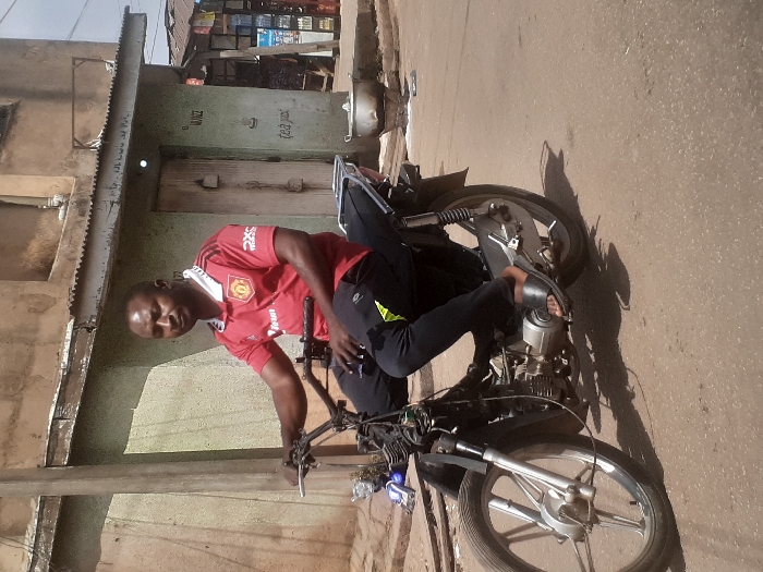 An adult male is depicted seated on a black step-through motorcycle on a paved road under bright daylight, presumably in Jos, Nigeria