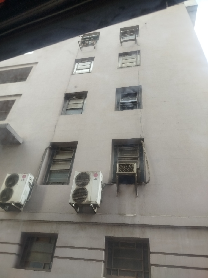 The image displays a section of a light-colored, multi-story building facade in Nairobi, Kenya, viewed from a low angle looking upwards. White smoke is actively emanating from at least two distinct window openings on separate levels, specifically from a window on the middle-right side of the frame, indicating an active fire event within the structure. Several other windows are visible, some partially ajar. Two white LG-branded split-system air conditioning outdoor units are mounted on the facade below a row of windows; an additional older, window-mounted air conditioning unit is present to the right. Utility conduits and a thin cable are affixed to the building surface. No individuals or direct fire suppression activities are visible in the frame.