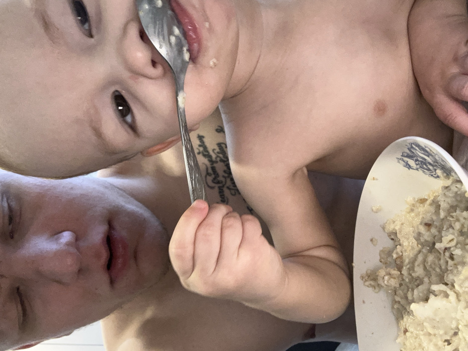 A parent and child are close together in a selfie style shot. The baby is being fed with a spoon that is in its mouth. The parent is slightly out of focus. A bowl of oatmeal is on the right side of the frame. The baby is fair skinned and shirtless. The parent has a tattoo on their chest. The image is rotated to the left.