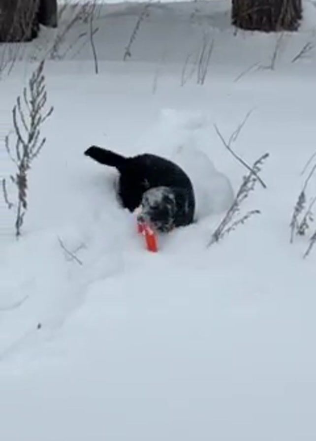 A black dog with a reddish-orange disc toy in its mouth is standing in a snowy outdoor environment