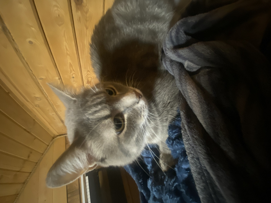 - "A gray cat lies comfortably on a soft blue and gray blanket" by FM-tUrX33, licensed under CC BY 4.0