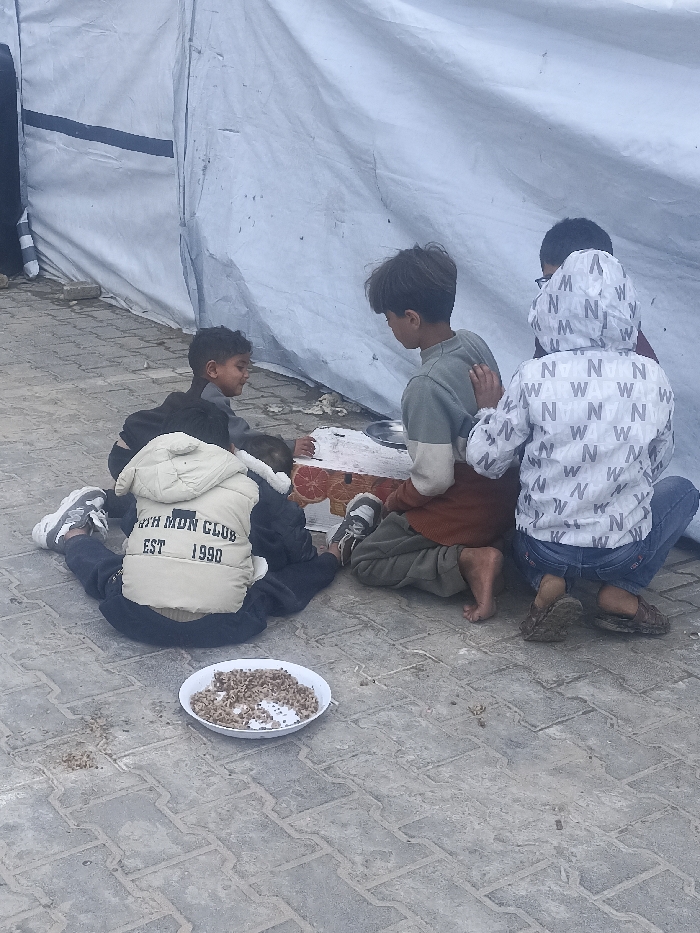 Five children are gathered on a grey paved surface in front of a large, light-colored tarpaulin tent or makeshift shelter in the city of Gaza, Palestinian Territory. In the foreground, a white plate containing a portion of dark brown, granular food, likely a lentil or rice dish, rests on the pavers, with some food scattered nearby. From left to right: 1. A child wearing a beige puffer vest with "TRTH MON CLUB EST 1990" on the back, black pants, and grey and white sneakers is seated on the ground, facing away from the camera with legs spread. 2. To their right, a younger child in a dark grey top is seated, looking towards another child and smiling. 3. A child with dark hair, wearing a light green and brown long-sleeved shirt, is seated barefoot, facing sideways towards a small, makeshift table or box constructed from a cardboard box with an orange fruit pattern. A metal plate or bowl sits on this surface. 4. Crouched on the right, facing away from the camera, is a child wearing a white hooded jacket patterned with repeating "N" and "W" letters, blue jeans, and dark sandals. This child has a hand resting on the shoulder of the child in the green and brown shirt. 5. Partially visible behind the child in the white hooded jacket is another child wearing glasses. The ground is composed of interlocking grey pavers. The tent or shelter material forms the background, appearing somewhat soiled. The overall lighting suggests an overcast or muted daytime condition.