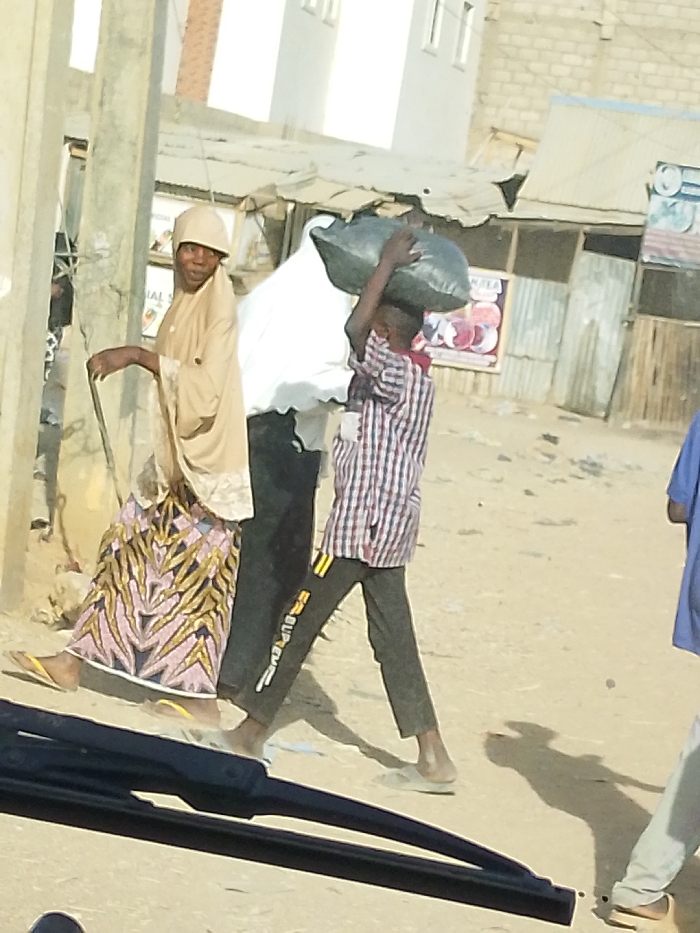 On a dusty street, a woman in a tan head covering and patterned skirt walks with a cane. Beside her, a child carries a large black bag atop their head. The child wears a plaid shirt and dark pants with white lettering. Buildings and shops line the background, and a glimpse of a car windshield is visible in the foreground. Another person in a blue shirt walks on the right side of the image.
