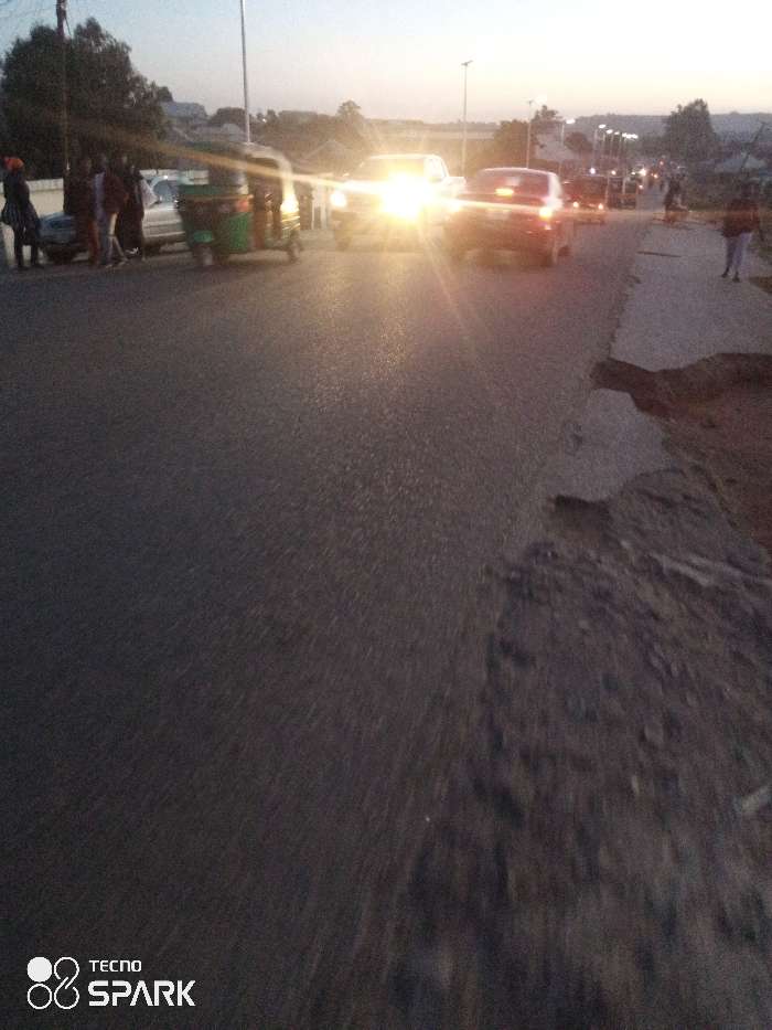 The image displays an urban street scene in Jos, Nigeria, during twilight or early evening hours. The foreground is dominated by a dark asphalt road surface. On the left side of the road, a group of approximately five to seven individuals is gathered around a light-colored sedan, which appears stationary. Adjacent to this gathering, a green auto-rickshaw (keke Napep) is partially visible, facing away from the camera. In the right lane of the road, a white pickup truck is prominently featured, facing towards the camera with its headlights fully illuminated, creating a bright glare and lens flare. Behind the pickup truck, a darker sedan is also visible, with faint taillights or brake lights illuminated. Further down the road in the distance, multiple vehicles, including additional auto-rickshaws, are visible, all with activated headlights, indicating active traffic flow. On the right side of the road, there is an uneven, eroded dirt and gravel shoulder, on which a single individual is seen walking away from the camera. The background reveals a light blue-grey sky transitioning into dusk, with silhouettes of trees and distant buildings. Multiple streetlights, some appearing to be solar-powered, line the road further into the distance.