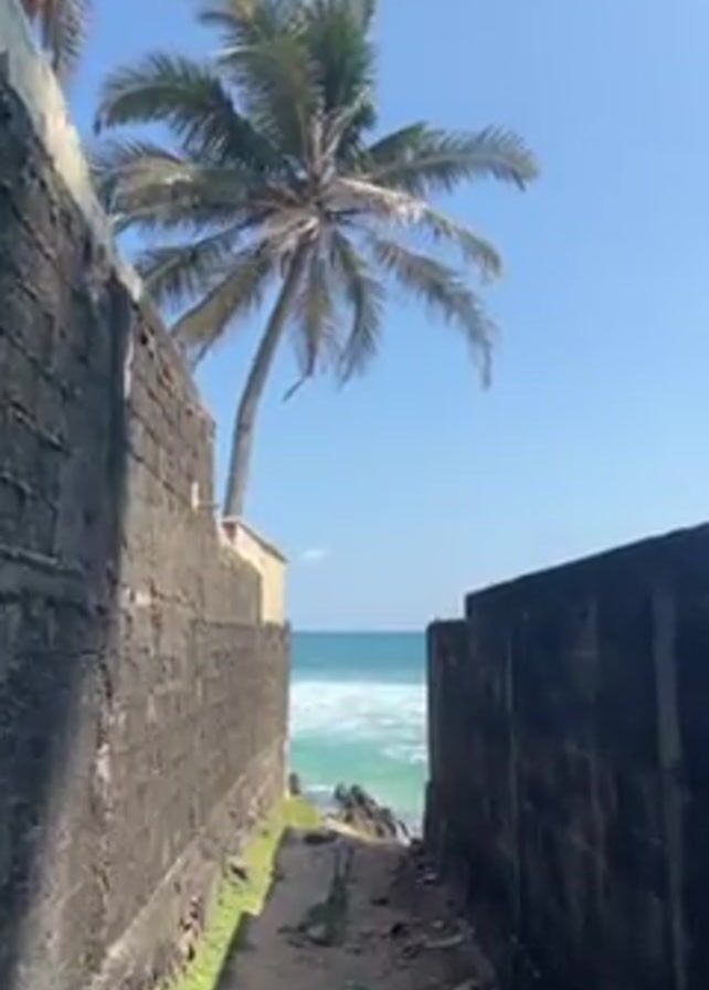 narrow path between two dark brick walls leading to the ocean. Palm trees are visible above the walls, with a clear blue sky in the background. The ocean has turquoise water and visible waves. The path appears to be made of dirt and has some vegetation growing along the sides. There's some scattered debris on the ground. The scene is static, with no apparent people or movement.