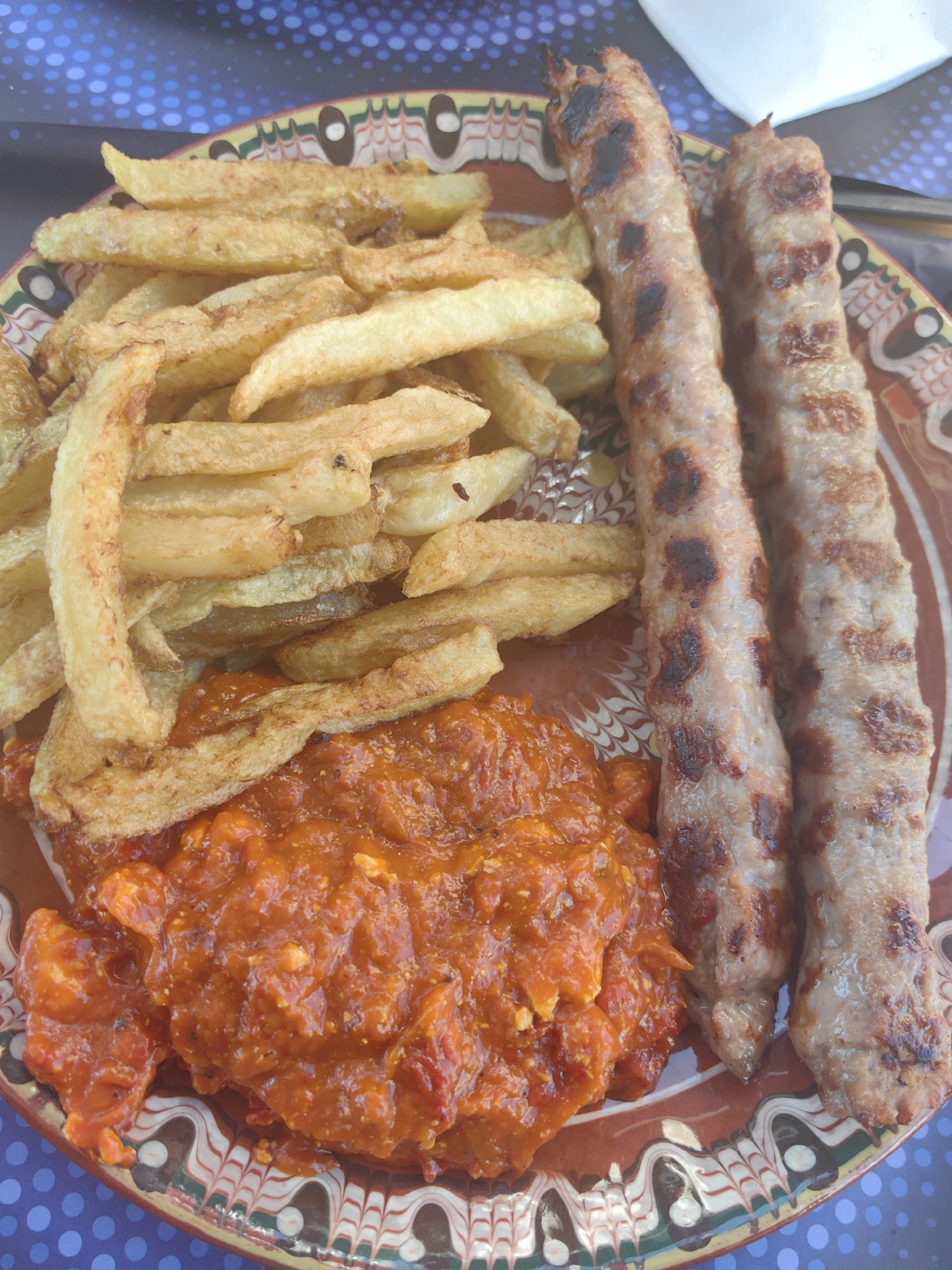 plate of food. The dish consists of two grilled kebabs, a serving of french fries, and a spoonful of orange-red sauce. The plate itself is made of ceramic and has a decorative border with a pattern of brown, green, and white shapes. The food is placed on a table with a blue tablecloth with white polka dots. The photo was taken in Bozhurishte, Bulgaria.