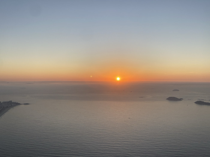 - "An aerial view captures a sunrise over the Atlantic Ocean in Rio de Janeiro, Brazil, from an elevated vantage point such as Vidigal or Morro Dois Irmãos, looking eastward/southeastward over the Ipanema and Leblon coastline" by FM-T4gP12, licensed under CC BY 4.0