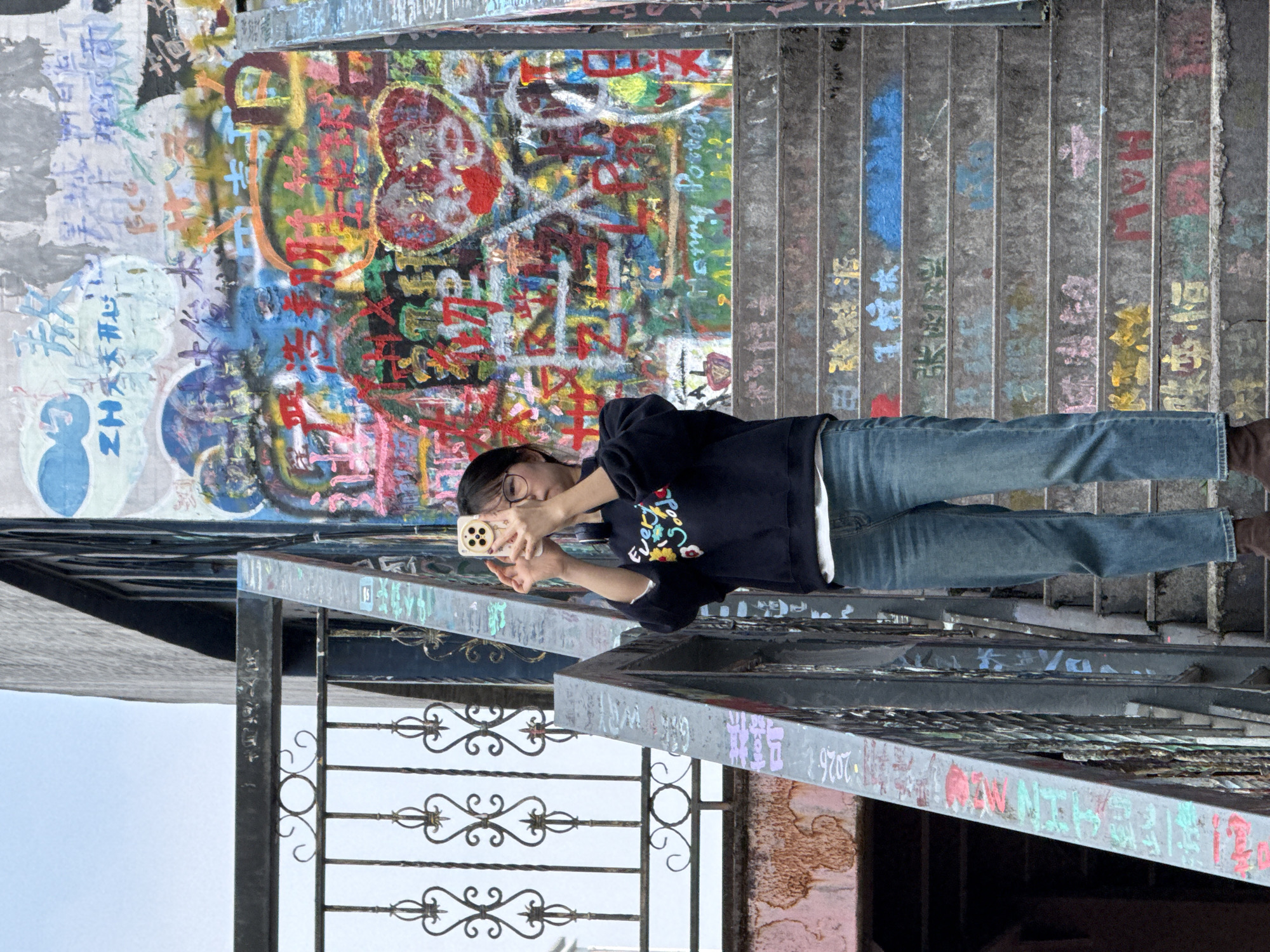 The image depicts a young East Asian female standing on a graffiti-covered concrete staircase in Jiulongpo District, China. She wears a dark blue crew-neck sweatshirt with colorful embroidery, a white undershirt, light blue denim jeans, and brown ankle boots. She has dark hair and wears spectacles, with black headphones resting around her neck. The subject holds a light-colored smartphone horizontally with both hands at chest level, pointing it forward, indicating the act of taking a photograph or video. The concrete stairs beneath her are extensively marked with multi-colored graffiti, primarily Chinese characters. To the left of the subject, a dark metal railing with decorative, scrolled elements is visible, also displaying some graffiti and wear. Beyond the railing, a rusted reddish-brown metal beam is partially visible. The vertical wall behind the subject is densely covered in vibrant, layered graffiti, featuring various Chinese characters, abstract designs, a prominent red heart symbol, and English words including "Harry Potter." The upper background shows an overcast sky and a grey building structure, indicating an urban outdoor environment with significant street art.