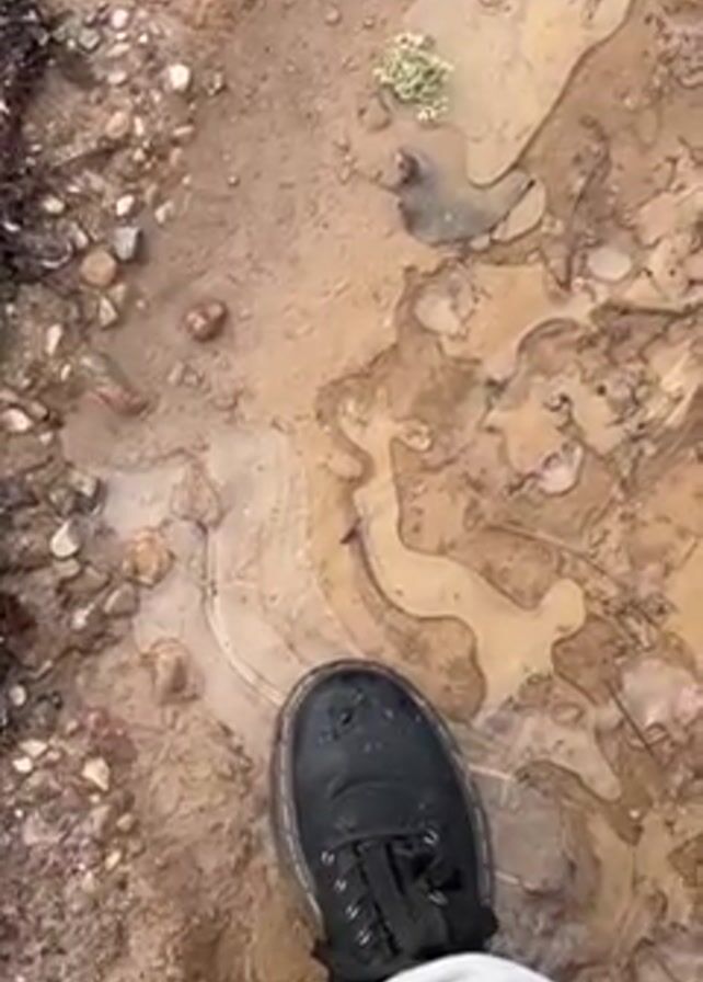 A person is standing in a muddy puddle with a black shoe. The ground around the puddle consists of sand, pebbles, and some plant matter. The puddle is partly frozen, as a thin layer of ice breaks under the person's foot. The sound of the ice cracking can be heard.