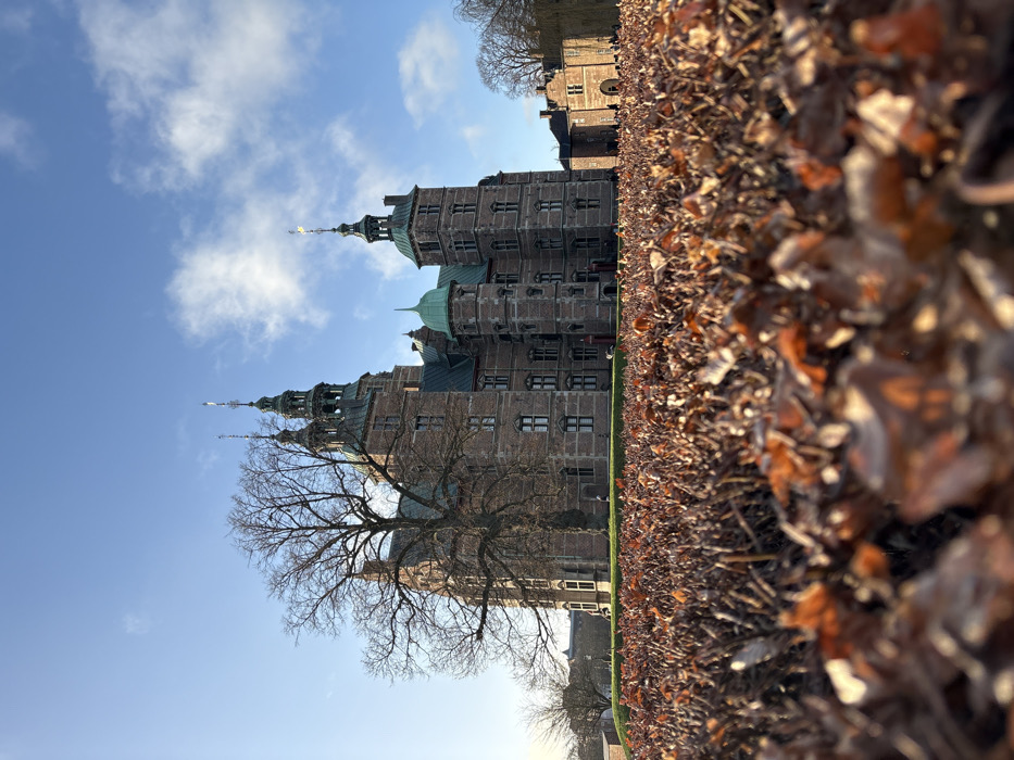 The image presents Rosenborg Castle, located in Copenhagen, Denmark, viewed from a low-angle perspective