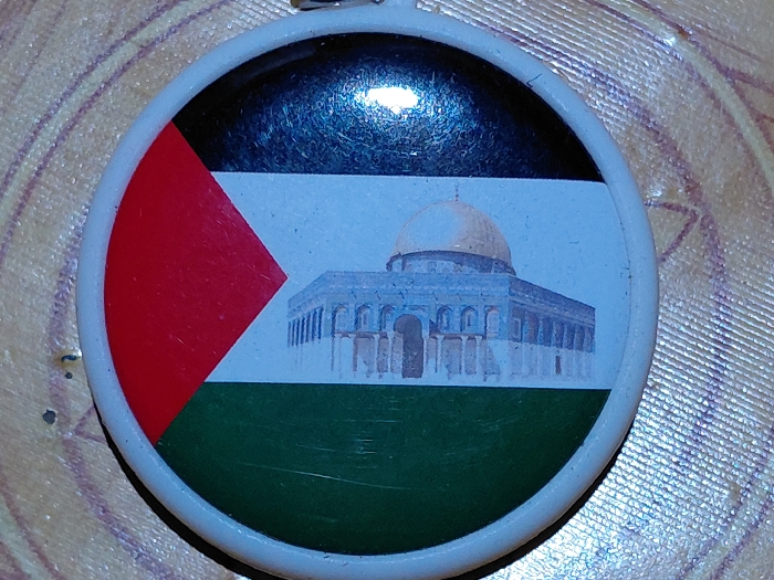 A round pendant displays colors mimicking the Palestinian flag: black, white, red, and green