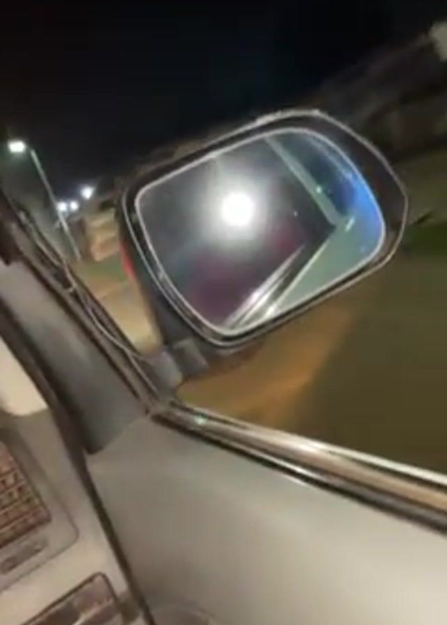 car's side mirror at night. Streetlights and another vehicle's tail lights are visible in the mirror. The interior of the car is partially visible. The car appears to be stationary.