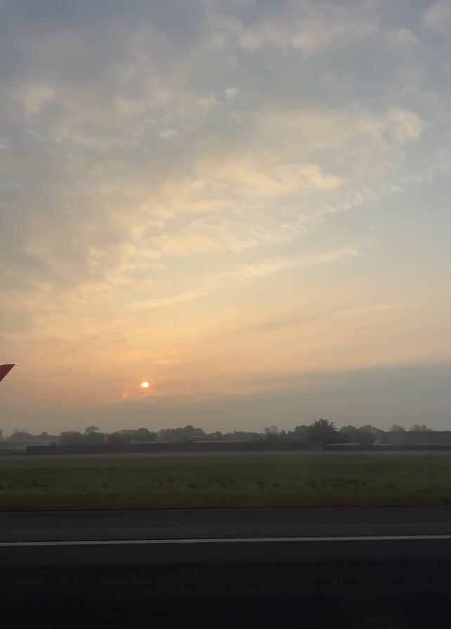 view from inside an airplane, looking out over a runway at sunrise. The sun is visible as a bright circle in the sky, partially obscured by clouds. A small part of the airplane's wing is visible in the lower left corner. Beyond the runway is a green field with trees in the distance, partially shrouded in fog. The sky is filled with a mix of white and gray clouds.