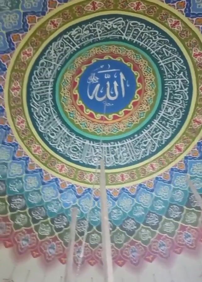 view looking up at a mosque dome. The dome is intricately decorated with circular patterns and Arabic calligraphy. At the center of the dome is the word "Allah" in Arabic script, set against a blue background. The rest of the dome is adorned with layers of colorful, geometric patterns and additional Arabic calligraphy in white. Several metal poles or supports are visible, extending upwards into the scene from the lower part of the frame, partially obstructing the view of the dome. The camera moves slightly during the video.