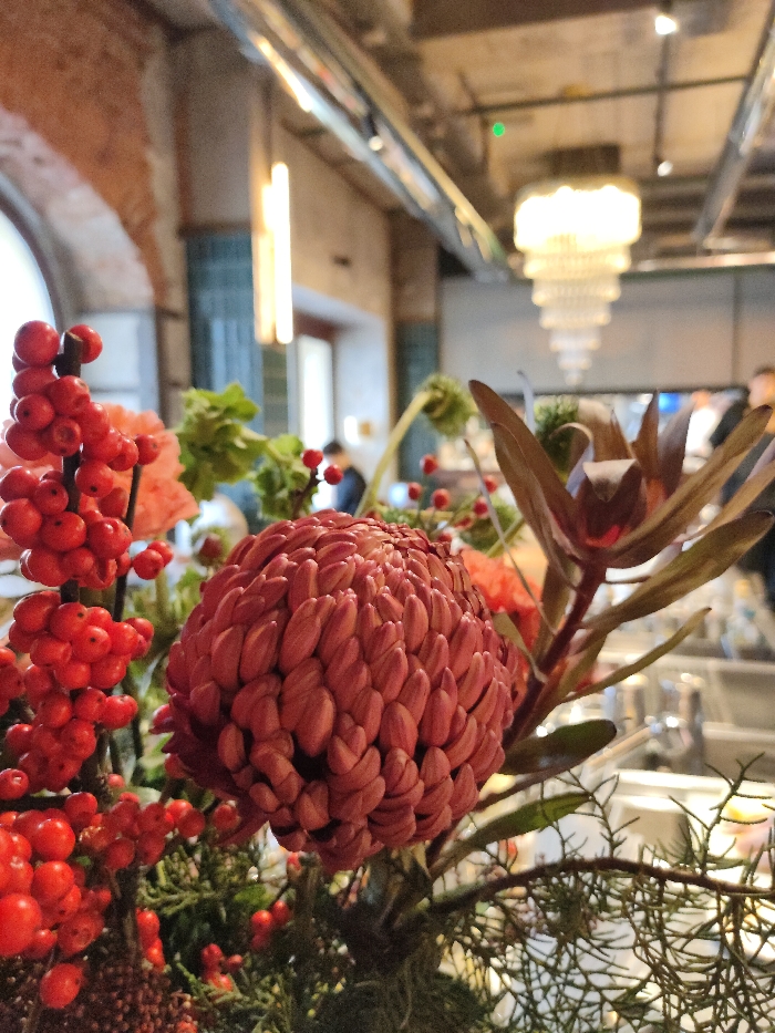 The image depicts a close-up, shallow-depth-of-field view of a floral arrangement situated within a modern, industrially-styled interior identified as Kuznya House (Кузня) at Sevkabel Port (Севкабель Порт) on Vasilyevsky Island, Saint Petersburg, Russia. In the foreground, a prominent floral display is present. To the left, several stems are heavily laden with clusters of small, spherical, bright red berries. Central to the arrangement is a large, globular flower, approximately 10-15 cm in diameter, composed of numerous tightly packed, scale-like, reddish-pink to reddish-brown bracts, resembling a Protea variety. To the right of this central flower, another floral element displays broad, deep reddish-brown leaves or bracts, forming a more open, cup-like shape. The base of the arrangement includes dark green, needle-like foliage. The background is softly blurred but reveals the interior architecture of the establishment. Visible elements include exposed reddish-brown brickwork, particularly an arched structure on the left. Adjacent to the brick, sections of vertically oriented, rectangular tiles, appearing in a muted blue-green or teal color, are present on the wall. The high ceiling features exposed metallic ventilation ducts or pipes. Modern lighting fixtures are visible: two vertical, illuminated light bars on the wall in the mid-left, and a prominent, tiered, white or clear chandelier hanging from the ceiling in the mid-right. A small, bright green light or indicator is visible on the ceiling in the upper-center. Several indistinct human figures are discernible in the blurred background; one figure, seen from behind wearing a dark top, appears near a counter or bar area in the far right, suggesting an interaction. Partially visible stainless steel or metallic surfaces are present in the far right background, consistent with a food service area. The overall environment presents an industrial-chic aesthetic, indicative of a repurposed historic building functioning as a restaurant or event space.