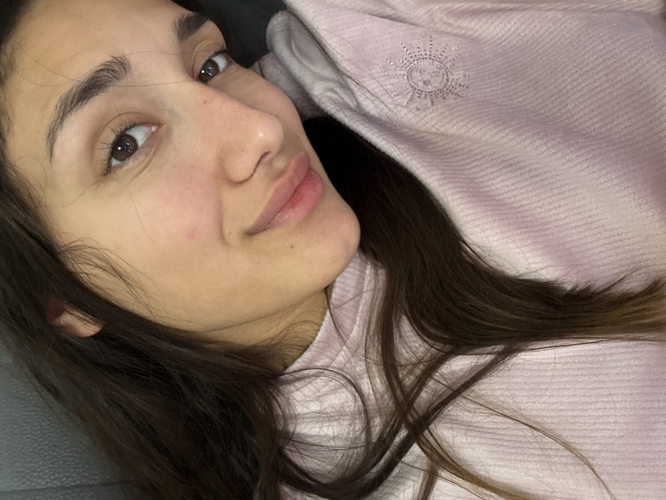 The image displays a close-up, diagonally oriented shot of a single individual, a female, from the upper torso upwards. She has dark brown hair, dark brown eyes, fair skin, and full lips. Her expression includes a slight smile. She wears a light pink, ribbed, long-sleeved top. The garment features an embroidered design on the right shoulder area, depicting a stylized sun with a face surrounded by rays. The background is dark and indistinct, suggesting an indoor setting. The specific location within Budva, Montenegro, is not discernible from the visual information provided in the image.