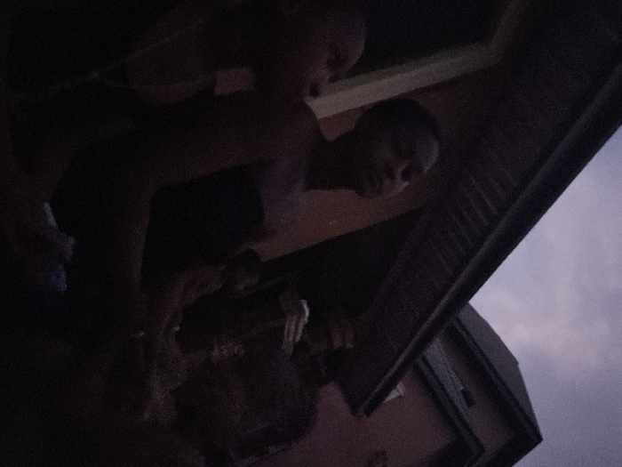 The image captures two people under a covered area, possibly a porch. One person is slightly out of focus, while the other's face is visible. A vertical beam-like structure frames the right side of the view. The sky is partially visible above the building, and the lighting is dim, casting the subjects in shadow. The scene conveys an intimate or candid moment, partially obscured by low lighting.