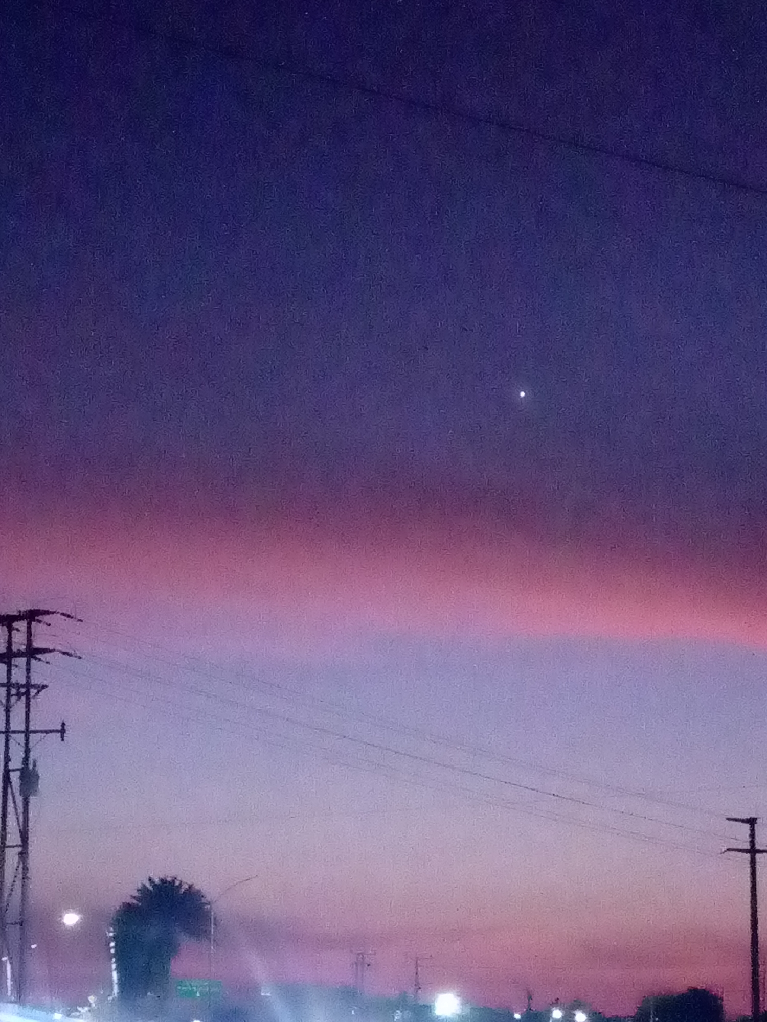 dusk or dawn sky with a gradient of purple and pink hues. A single bright star or planet is visible in the upper part of the sky. In the lower portion, there are silhouettes of trees and utility poles with power lines running across the scene. There are also some blurry lights, possibly from streetlights or vehicles. The location cannot be identified with the provided image.