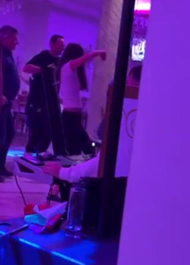 group of people dancing in a room with purple lighting. There are several people visible, including a woman in a white shirt and black pants who is dancing near a keyboard. A man is playing the keyboard, and there are other people standing around watching and dancing. The room has a festive atmosphere, possibly a wedding or party. There's a chandelier visible in the background. A glass is placed on the keyboard stand.