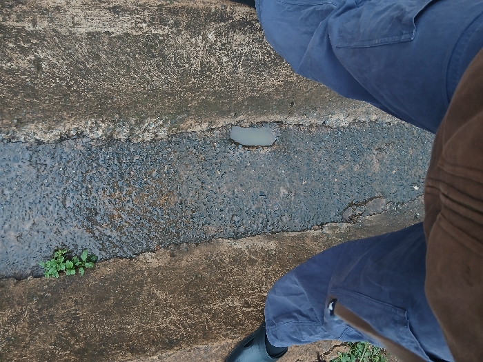 The image depicts a top-down view of ground features in Witeithie ward, Kenya, framed between the legs of an individual. The individual wears dark blue cargo pants, a brown upper garment visible at the bottom of the frame, and a dark shoe on the left foot. A central, narrow channel of wet, dark, coarse aggregate material, consistent with a drain or a seam in asphalt, runs vertically through the image. Surface water is evident within this channel. Flanking this central channel are wider sections of light-gray, textured concrete or worn paved surface. A small cluster of green leafy plants emerges from the crack between the left concrete section and the dark channel in the upper left quadrant. A single, light-colored, elongated object rests within the dark channel towards the right-center.