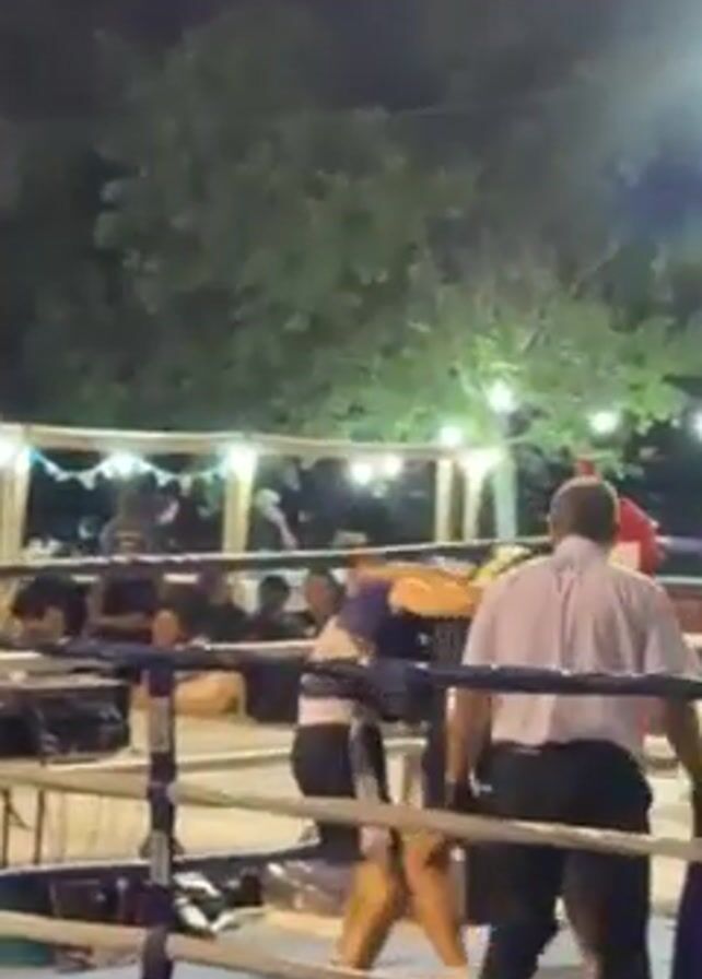 n outdoor boxing match at night. Two boxers, one in black and one in blue, are in the ring exchanging punches. A referee is closely monitoring the fight. The boxing ring is surrounded by a crowd of spectators. String lights are strung overhead. There are tables and chairs around the perimeter of the boxing ring. A decorative mural is visible in the background.