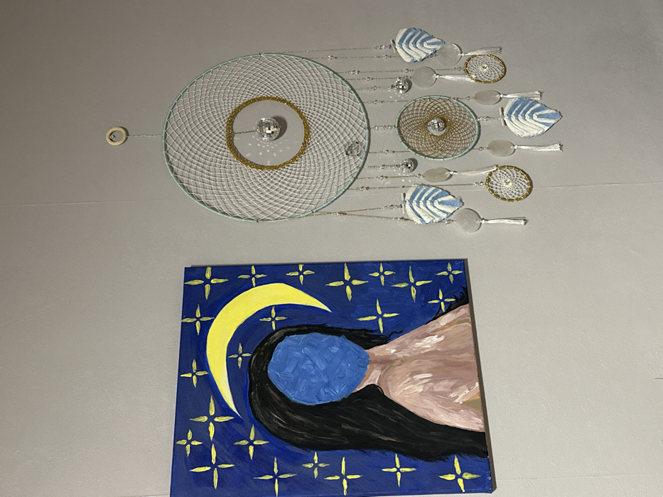 A dreamcatcher hangs above a painting on a gray wall. The dreamcatcher consists of a large circular net with a mirrored ball in the center, smaller circular nets with mirrored balls, decorative beads, and feathered accents. The painting below is a square canvas with a blue background, yellow star shapes, and a yellow crescent moon. A female figure is depicted in profile with a blue orb covering the face and dark flowing hair.