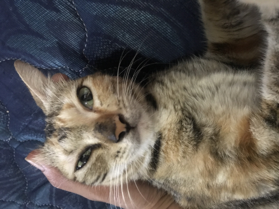 A close-up, vertical-format photograph taken in Bogor, Indonesia, depicts a domestic cat. The animal is a calico or tortoiseshell, exhibiting tabby patterns with fur in shades of cream, ginger-orange, dark brown, and black. It has distinct green irises; its left eye is partially closed, while its right eye is open and directed at the camera. A human hand, exhibiting light brown skin, is visible on the left side of the frame, gently cupping the cat's head near its left ear. The background consists of a dark blue, quilted fabric surface displaying a patterned stitch.