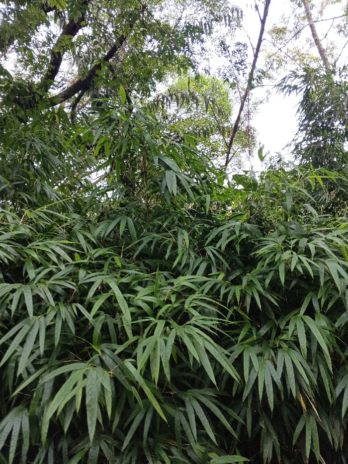 The image displays a dense natural environment located in Situm, Papua New Guinea. The scene is dominated by vibrant green foliage, primarily bamboo, which fills the majority of the frame from the foreground to the midground. The bamboo leaves are elongated and pointed, exhibiting various shades of green, with some areas appearing slightly darker due to overlap and depth. Above the bamboo, in the upper portion of the image, the canopy of taller, mature trees is visible. These trees feature thicker branches and broader leaves, with some lighter-colored elements or dead foliage hanging. Patches of bright, diffused light are visible through gaps in the canopy, indicating an overcast or hazy sky condition. No human subjects, animals, or man-made objects are present. The image captures a static, natural botanical setting under daylight.