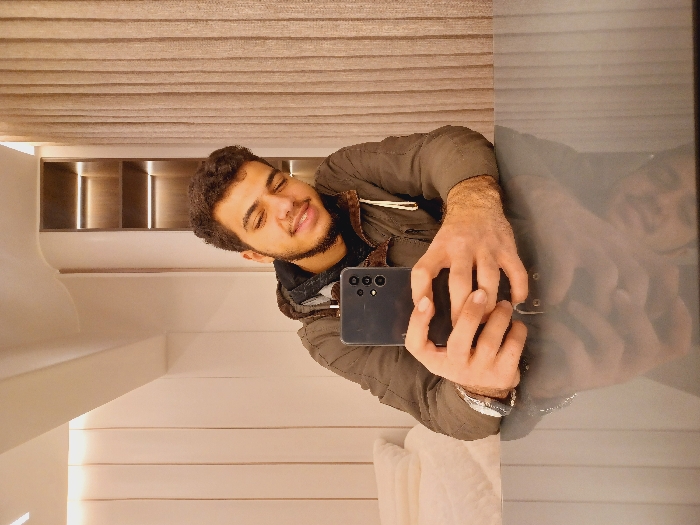 A person with dark hair and a beard smiles, holding a dark-colored smartphone with multiple camera lenses. He is wearing a brown jacket over a black hooded shirt. The photo appears to be taken in front of a mirror, with the person's reflection visible. The background includes white walls, a wooden-slat ceiling, and illuminated shelves. A white fabric object sits behind the person. The lighting is soft and warm.