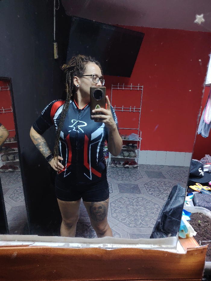 A full-body mirror selfie captures a person, likely female, with dreadlocked hair, glasses, and a dark stud earring in the left ear. The subject wears a black, red, and white short-sleeved cycling jersey featuring a "ZR" logo and "RIMING" text, black shorts, and a dark smartwatch on the left wrist. Tattoos are visible on the left forearm and the lower portion of the left thigh. The subject's right hand holds a dark-colored smartphone with a prominent rear camera module, positioned to capture the reflection. The background, visible in the mirror, displays an indoor setting with a dark grey wall to the left and a vibrant red wall to the right. A multi-tiered white metal shoe rack, containing several pairs of shoes, stands against the red wall. A dark, rectangular screen is mounted high on the dark grey wall. The floor is covered with patterned grey tiles. The bottom edge of the mirror features a light-colored, possibly wooden, frame. On the bottom right of the mirror's surface, outside the main room reflection, a black baseball cap, other assorted items, and a container of soil are visible. The image does not provide information to identify the specific location within the city of Trujillo, Peru.