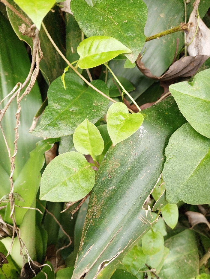 Lush greenery fills the frame. Various leaf shapes and sizes intertwine, dominated by shades of green. Heart-shaped leaves contrast with elongated, spear-like leaves, showcasing a diverse range of plant life. Some leaves exhibit imperfections, such as tears and blemishes, adding a natural, organic touch. Tangled vines weave throughout, contributing to the overall density of the foliage.