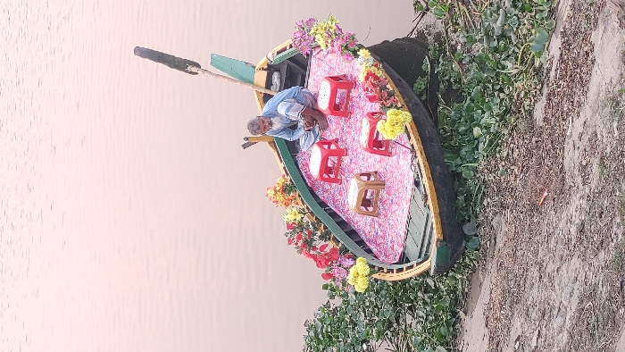 The scene depicts a traditional wooden boat partially beached on a muddy bank adjacent to a calm body of water in Purbachal, Bangladesh. The boat features a dark hull with a yellow stripe along the gunwale and green trim at the bow and stern. Its interior is covered with a pink, patterned fabric. Four small plastic stools are arranged inside: two red and two beige. The boat's gunwales are adorned with multiple artificial flower arrangements in red, orange, yellow, and purple. An elderly man, with a grey beard and wearing a light blue long-sleeved shirt and a white and blue striped lower garment, sits cross-legged at the boat's stern, looking downwards. A long wooden oar with a dark tip stands upright behind him. The water surface is smooth and reflects a soft, pale light. Abundant green aquatic vegetation, consistent with water hyacinths, floats around the boat and along the muddy bank.
