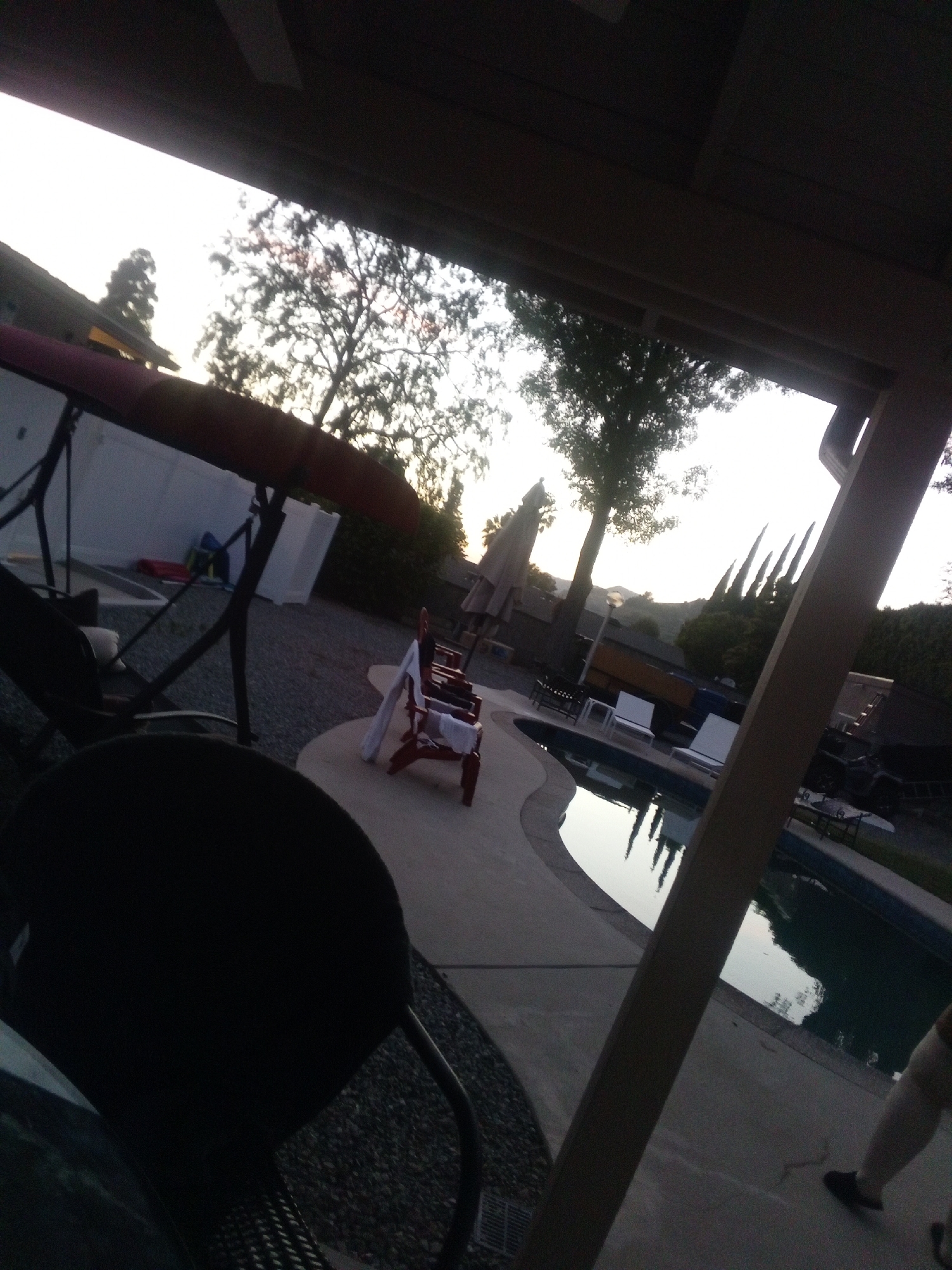 This image depicts an outdoor residential backyard in the city of Los Angeles, United States of America, under twilight conditions. The upper portion of the frame is dominated by a bright, overcast or post-sunset sky, silhouetting trees and distant hills. In the foreground, a dark, out-of-focus object, likely a chair back, is positioned at the lower left. To its right, a black metal frame structure, consistent with a swing or hammock stand, supports a red, elongated object resembling a kayak or canoe. The ground beneath this area is covered in gravel. The midground features a concrete patio pathway that curves around a kidney-shaped swimming pool containing reflective water. On the patio, three red wooden Adirondack-style chairs are visible, each with a white towel draped over its back. A large, tan patio umbrella is positioned to the left of the pool. The background shows a variety of trees, including tall, slender cypress trees and broadleaf trees, alongside visible sections of residential structures. Distant hills are silhouetted against the bright sky. On the far right of the frame, the lower legs and feet of an individual wearing dark shoes and light-colored trousers are visible, walking away from the camera on the concrete patio. A drain grate is present in the lower center on the gravel surface. No direct interactions between individuals are depicted.