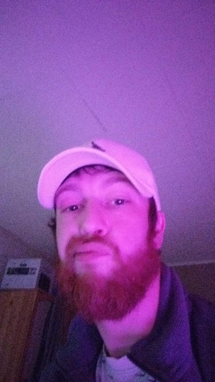 An adult male is captured in a head-and-shoulders portrait, taken indoors in Gurkovo, Bulgaria. The subject has a reddish-brown beard and is wearing a light-colored baseball cap reversed on his head, along with a dark outer garment over a lighter inner shirt. He is looking directly at the camera. The entire scene is uniformly illuminated by a strong purple-pink light, which saturates all visible elements and contributes to the image's grainy texture. In the lower-left background, a blurry section of a light-brown wooden furniture piece is visible, with an indistinct rectangular object positioned on its surface.