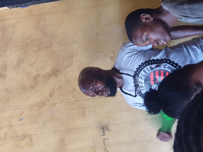 The scene is located in a city of Unknown, Unknown. An adult male, appearing to be of African descent, with a shaved head and dark beard, stands slightly to the left of the frame's center, looking towards the viewer's left. He wears a light grey T-shirt featuring a prominent black and white circular graphic with the text "LIPP PLEIN" and a skull design. Eyeglasses on a black strap hang around his neck. Visible perspiration covers his forehead and face. To the right of the adult male and slightly in front, a young male, also appearing to be of African descent, looks intently towards the viewer's right. He has short dark hair and wears a light grey T-shirt. In the lower left foreground, the top of a head with dark hair tied in a bun is partially visible, obscuring the adult male's lower torso. A blurred green bottle with a reddish-brown end is visible near this foreground figure. The background consists of a textured, light brown wall. Faint, handwritten graffiti is present on the wall, including the word "CREED" and partially legible text that appears to read "Sunny bank?". The environment suggests an indoor setting with ambient lighting. No direct interactions between the visible individuals are apparent; both the adult male and young male are focused outside the immediate frame.