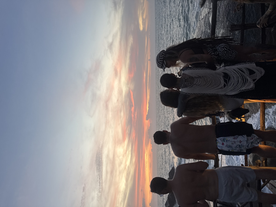 A group of people are watching a vibrant sunset over the ocean. Two shirtless men in swim trunks stand at the front. Behind them, a woman hugs a child. Another woman with long hair and a striped hat leans forward. They stand near a wooden structure or railing, with the waves crashing on rocks below. The sunset fills the sky with pink, orange, and yellow hues.