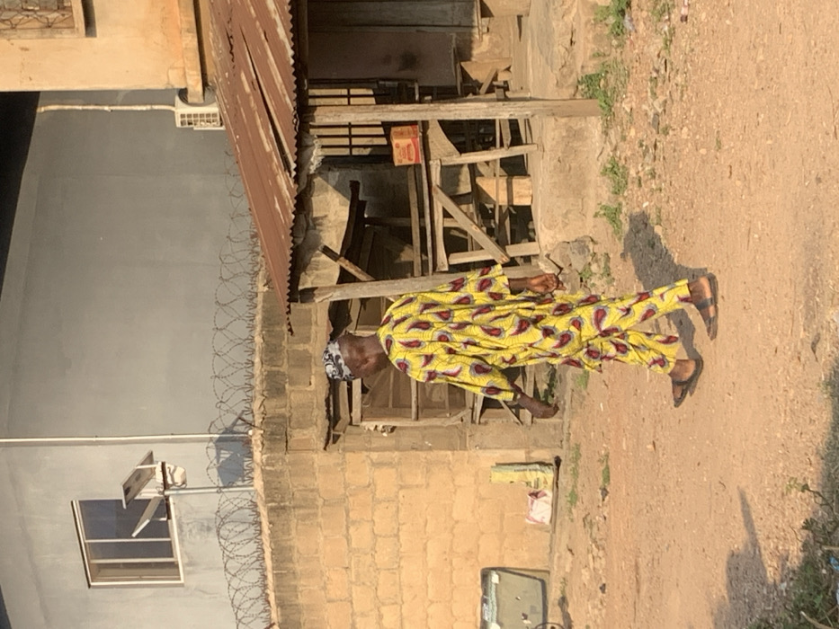 An elder in a yellow patterned outfit and sandals stands on a dirt path in front of a building