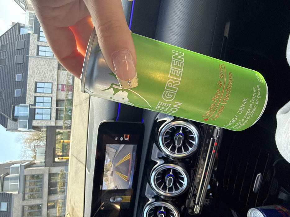 The scene is captured from inside a vehicle, specifically a Mercedes-Benz, showing its dark-toned dashboard and a portion of the passenger side. A human hand with manicured nails, featuring French tips and small embellishments, occupies the foreground, holding a green Red Bull "LIME GREEN EDITION" energy drink can. The can's label displays text including "Curuba-Fleur de sureau" and "Curuba-Vlierbloesem". On the dashboard, an infotainment screen displays a rear-view camera perspective with yellow guiding lines and a red boundary line. Below this, three circular air vents with chrome bezels exhibit blue internal ambient lighting. A control panel with illuminated red indicators is positioned beneath the vents. A red and silver Red Bull can is partially visible in a storage compartment to the lower left. Through the windshield, the exterior environment in Temse, Belgium, is visible. This includes two modern, multi-story buildings with light-colored facades, multiple windows, and glass balconies. The building on the right features a dark, pitched roof with skylights. An archway or entrance, guarded by yellow bollards, is situated between the two structures. Sparse, bare trees are present in the background. The sky is clear blue, indicating daytime conditions.